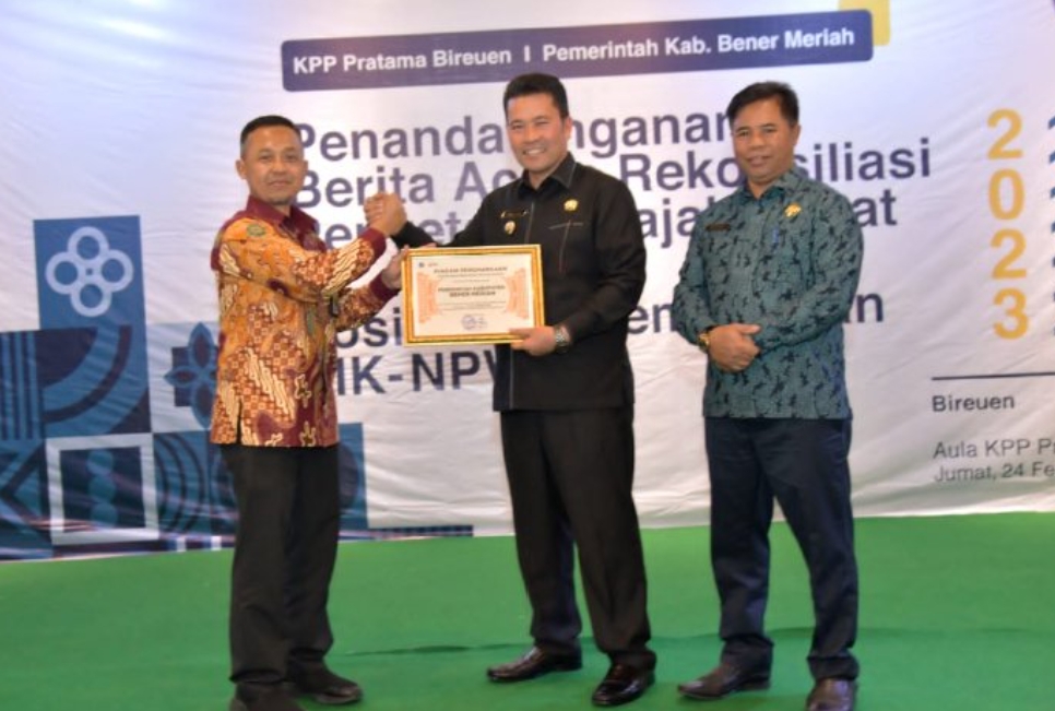 Penghargaan tersebut, diterima langsung oleh Pj Bupati Bener Meriah, Drs. Haili Yoga, M. Si, di sela acara penandatanganan berita acara Rekonsiliasi Penyetoran Pajak Pusat dan Sosialisasi Pemadanan NIK-NPWP di aula KPP Pratama Bireuen, Jumat (24/2/2023).