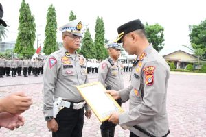 Pemberian penghargaan diserahkan langsung oleh dari Kapolres Aceh Timur AKBP Andy Rahmansyah, S.I.K. pada saat Apel Pagi di Lapangan Sarja Arya Racana, Senin, (31/07/2023).