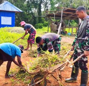 Anggota Satgas terlihat senang dan Bahagia bersama Masyarakat membersihkan lingkungan tempat ibadah, tidak hanya di Gereja Distrik Kagewot, kegiatan ini juga dilaksanakan di Distrik lain yang terdapat Pos Pengamanan Satgas Pamtas Statis RI-PNG Yonif 111/KB.