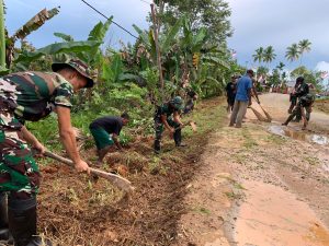 Anggota Satgas dari Pos Arimob dipimpin Letda Inf.Rohman Sarun bersama masyarakat kampung maju melaksanakan gotong royong dalam rangka menerapkan program unggulan kampung sehat antisipasi penyakit malaria dikarenakan saat ini sudah masuk musim hujan.