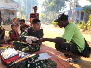 Boven Digoel – Satgas Pamtas Statis RI-PNG Yonif 111/KB Yang Melaksanakan Tugas Ops dibawah Kolakops Korem 174/Anim Ti Waninggap Wilayah Perbatasan Papua Selatan melalui Program Binter Kitorang Basudara memberikan pelayanan kesehatan gratis kepada masyarakat, Senin (05/02/2024).