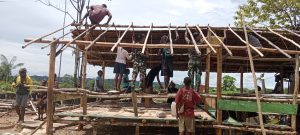 Anggota Pos Upkim dipimpin Lettu Inf. Wanda Yudhistira Aryanto, S.Tr.(Han) bersama masyarakat Kampung Upkim Distrik Waropko Kabupaten Boven Digoel Propinsi Papua Selatan melaksanakan kegiatan gotong royong membangun Pondok kesehatan tradisional untuk mempermudah masyarakat pedalaman yang akan berobat kegiatan ini bagian dari Program Kampung Sehat.