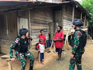 Anggota Satgas Pos Upkim melaksanakan Binter dikampung Upkim Distrik Waropko Kabupaten Boven Digoel Provinsi Papua Selatan, kegiatan ini dilakukan dalam rangka patroli keamanan sekaligus mengecek kondisi masyarakat kampung binaan.