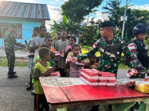 Pos Arimob Satgas Pamtas Statis RI-PNG Yonif 111/KB dipenghujung Ramadhan melaksanakan kegiatan berbagi untuk anak Kampung Maju Distrik Arimob Kabupaten Boven Digoel Papua Selatan.