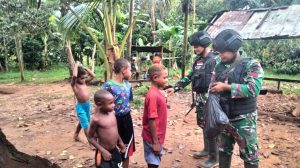 Anggota Satgas Pos Rawa Bustop melakukan Patroli keamanan sekaligus Binter dalam rangka melihat secara langsung kondisi masyarakat dikampung Bastop Distrik Jair Kabupaten Boven Digoel Papua Selatan.