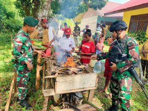 Boven Digoel – Satgas Pamtas Statis RI-PNG Yonif 111/KB yang bertugas diwilayah Kolakops Korem 174/Anim Ti Waninggap melalui Binter Kitorang Basudara mengajari anak sekolah cara memasak tumbuhan hasil hutan, Selasa (16/04/2024).