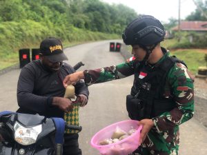 Anggota TNI dari Pos Mindiptana melalui Program Binter Kitorang Basudara membagikan bubur kacang hijau hangat kepada masyarakat yang melintas didepan Pos bertempat dikampung mindiptana Distrik Mindiptana Kabupaten Boven Digoel Papua Selatan.