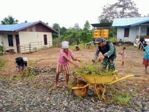 Anggota TNI Satgas Pamtas Yonif 111/KB dari Pos Amoan dipimpin Letda Inf.Muhamad Izas Islam, bersama masyarakat kampung Amoan Distrik Kombut Kab. Boven Digoel Perbatasan Papua Selatan bersama masyarakat melaksanakan kegiatan gotong royong membersihkan sampah dan genangan air tempat bersarangnya jentik nyamuk.