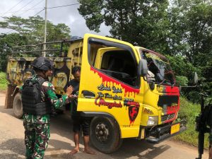 Anggota TNI dari Satgas Pamtas Statis RI-PNG Yonif 111/KB Pos Kanggewot melakukan pemeriksaan kendaraan yang keluar masuk perbatasan darat bertempat di Kampung Kanggewot Distrik Waropko Kab. Boven Digoel Papua Selatan.