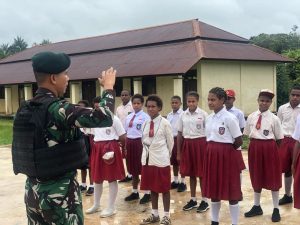 Anggota TNI dari Satgas Pamtas Statis RI-PNG Yonif 111/KB melalui Program binter kampung pancasila mengunjungi sekolah SDN Negeri 02 Mindiptana memberikan materi Wawasan Kebangsaan dan Peraturan Baris Berbaris ( PBB ), bertempat di SDN Negeri 02 Mindiptana, KM 75 Kab. Boven Digoel Perbatasan Papua Selatan.