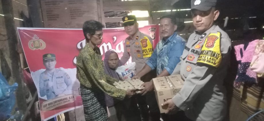 Global detik.com | ACEH TIMUR  –  Polsek Pante bidari Ipda Saiful Bahri SE, bersama Personilnya dari Bhabinkamtibmas dan didampingi Sektaris kepala Desa Muhammad, kunjungi rumah warga dalam rangka berbagi berkah memberikan sembako kepada warga tidak mampu .Aminah yusuf yang tinggal besama anak nya muklis di Desa seuneubok saboh