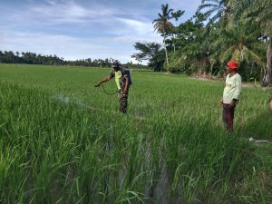Serka Darmi Sertu menuturkan kali ini babinsa juga ikut ke sawah untuk menyemprot tanaman padi, Penyemprotan ini guna mengantisipasi hama ulat maupun wereng. Selain itu juga untuk memberikan kesuburan terhadap batang padi serta menghilangkan rumput ilalang yang tumbuh di sekitar tanaman padi.