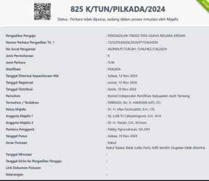 Globaldetik.com | Aceh Tamiang – Mahkamah Agung Republik Indonesia mengeluarkan putusan dengan mengabulkan permohonan kasasi yang diajukan oleh Komisi Independen Pemilihan (KIP) Kabupaten Aceh Tamiang terkait Sengketa Pengadilan Tinggi Tata Usaha Negara, 19-Nov-2024.