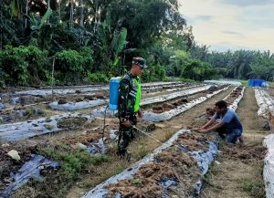 Aceh Tamiang – Babinsa Koramil 04/Bendahara Sertu F Hasibuan melaksanakan pendampingan petani semangka, Bapak Barian di wilayah Desa binaannya.