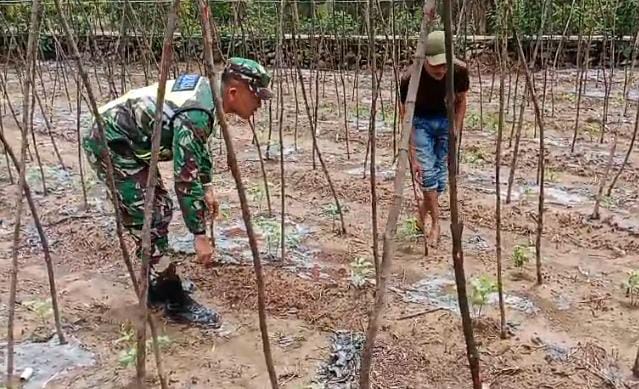 Aceh Tamiang – Bintara Pembina Desa (Babinsa) Koramil 06/Manyak Payed Sertu Riki Fernandes bersama masyarakat melaksanakan Komsos pendampingan pada tanaman kacang panjang di Desa Kasih Sayang, Kecamatan Manyak Payed, Kabupaten Aceh Tamiang. Kamis (16/01/2025)