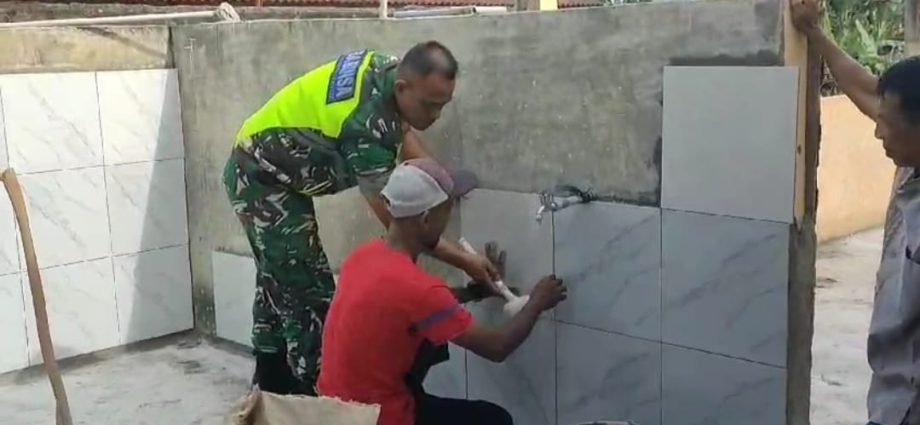 Aceh Tamiang – Anggota Koramil 01/Kuala Simpang Serda Joko membantu warga pemasangan keramik tempat Wudhu di Musholla Al- Raudah di Desa Bukit Tempurung, Kecamatan Kota Kuala Simpang, Kabupaten Aceh Tamiang.