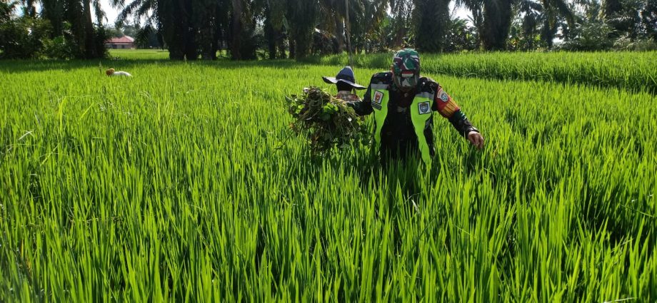 Aceh Tamiang – Bintara Pembina Desa (Babinsa) Koramil 06/Manyak Payed Serka Hendra bersama petani, pendampingan pertanian. Babinsa langsung turun ke sawah membantu petani membersihkan gulma (hama tanaman) rumput di lahan milik Ibu Aisyah, luas lahan 5 Rante di Desa Sapta Marga, Kecamatan Manyak Payed, Kabupaten Aceh Tamiang. Minggu (26/01/2025)