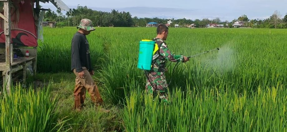 Aceh Tamiang – Babinsa Koramil 02/Karang Baru Serda Bendi M.J melaksanakan pendampingan pertanian membantu petani dalam membasmi hama padi.
