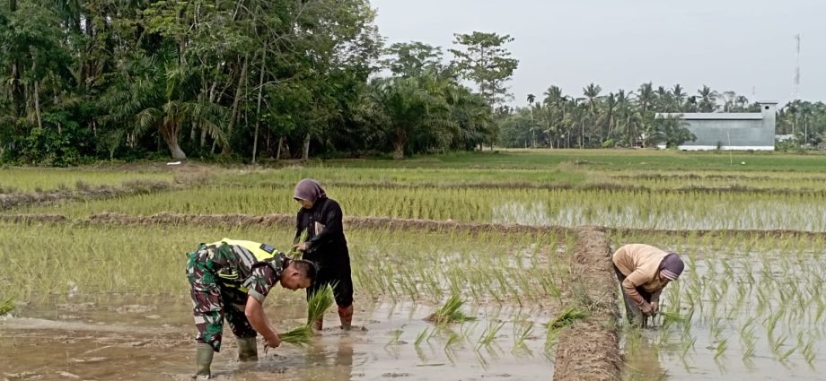 Aceh Tamiang – Babinsa Koramil 02/Karang Baru Serda Hendri Siregar turun langsung ke sawah membantu petani desa binaan menanam padi bertempat di Desa Paya Metah, Kecamatan Karang Baru, Kabupate Aceh Tamiang. Senin (10/02/2025)