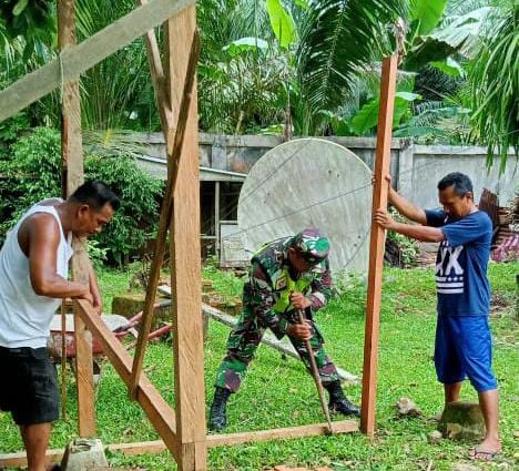 Aceh Tamiang – Anggota Pos Ramil Tenggulun Koramil 07/Kejuruan Muda Serda Tomas Riko bersama warga desa melaksanakan kegiatan gotong royong pembuatan Tempat Pengajian Anak (TPA) Al-Hidayah di Desa Simpang Kiri, Kecamatan Tenggulon, Kabupaten Aceh Tamiang. Rabu (12/02/2025)