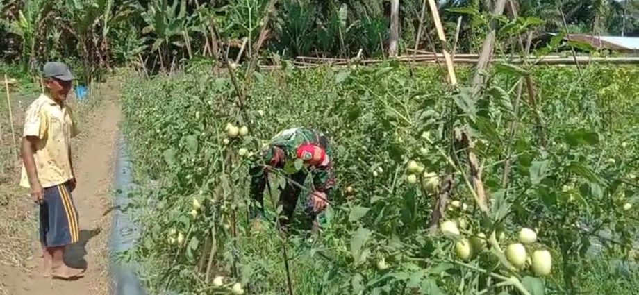 Aceh Tamiang – Babinsa Koramil 05/Tamiang Hulu, Kodim 0117/Aceh Tamiang Serda Edi Witoko mendampingi warga binaan membersihkan tanaman tomat milik Shadan di Desa Perupuk, Kecamatan Bandar pusaka, Kabupaten Aceh Tamiang. Senin (17/02/2025)