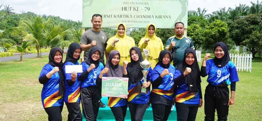 Keluar sebagai juara 1 Persit Kartika Chandra Kirana (KCK) Ranting 6 Ramil 05/Tamiang Hulu Sedangkan juara 2 ranting 8 Ramil 07/Kejuruan Muda dan juara 3 dirai oleh Persit KCK Ranting 1 Makodim 0117/Atam dalam pertandingan Bola Voli dalam rangka memeriahkan HUT Persit KCK ke-79, Rabu (19/02/25).