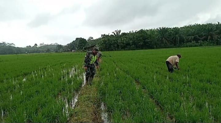 Aceh Tamiang – Babinsa Koramil 05/Tamiang Hulu Serka Tri Mulyadi bersama Petani melaksanakan kegiatan pendampingan memantau perkembangan tanaman padi, yang bertempat di Desa