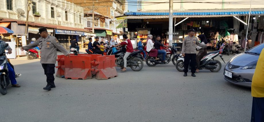 Anggota Polsek Tanah Jambo Aye melaksanakan kegiatan pengaturan lalu lintas dan pengamanan di pusat keramaian Kota Pantonlabu.