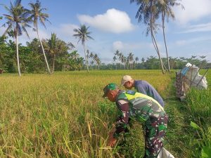 Memastikan langsung padi yang siap panen milik petani yang sebelumnya pada Awal musim tanam Babinsa senantiasa mendampingi hingga dengan turun ke sawah membantu proses penanaman padi, Hinga panenan nantinya.