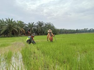 “Rumput di sekeliling tanaman padi jika dibiarkan akan mengganggu kesuburan padi bahkan lama kelamaan rumput akan menutupi tanaman padi, yang akhirnya akan membuat padi menjadi kurang sehat dan bahkan bisa mati. Untuk itulah diperlukan proses penyiangan rumput agar tanaman padi bisa tumbuh subur,”ucap Babinsa.