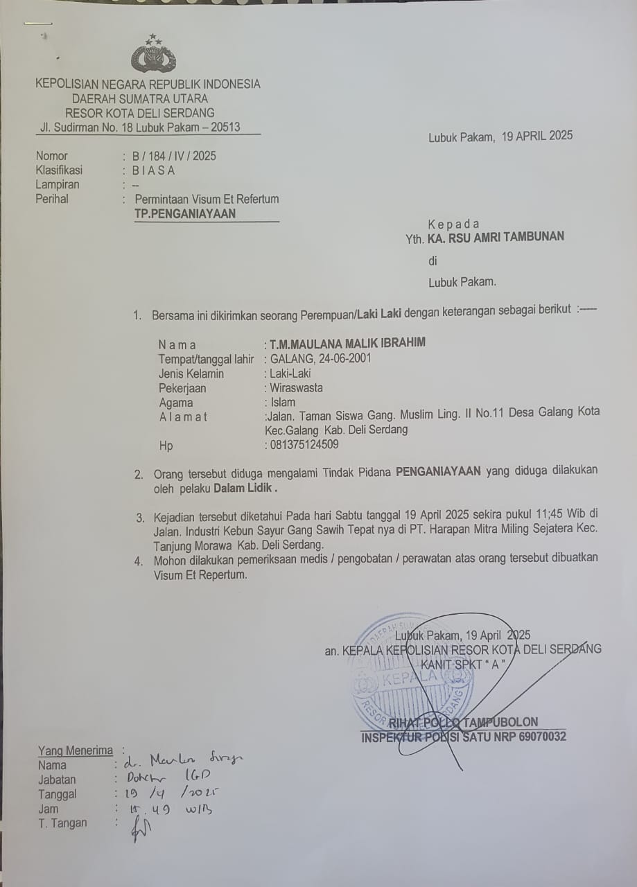 Kasus ini sudah dilapor kan ke Polresta Deli Serdang.