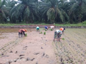 Aceh Tamiang – Bintara Pembina Desa (Babinsa) Koramil 04/Bendahara, Kodim 0117/Aceh Tamiang Serda Harmiadi dengan penuh semangat melakukan pendampingan terhadap petani yang tergabung dalam Kelompok Tani yang sedang menanam padi di Desa Mesjid Sungai Iyu, Kecamatan Bendahara, Kabupaten Aceh Tamiang. Minggu (20/04/2025)