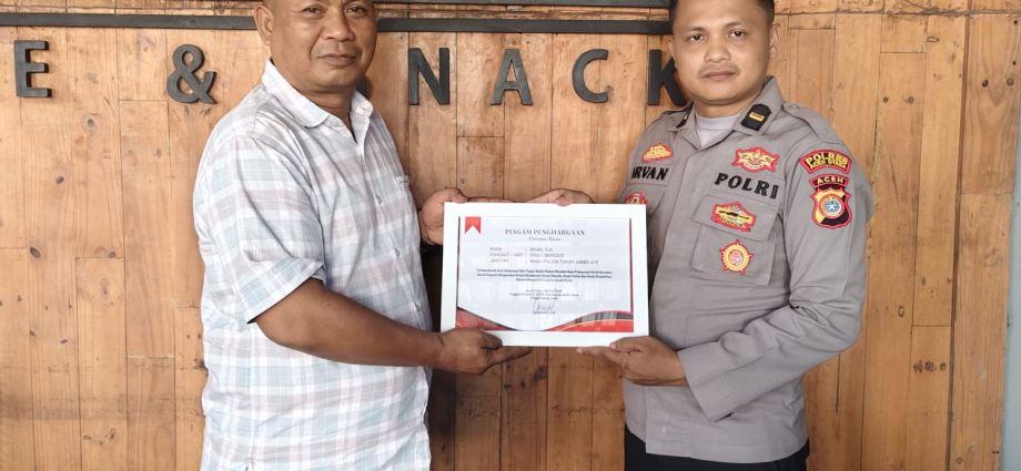 GLOBALDETIK.COM | ACEH UTARA-Atas dedikasi dan kiprahnya dalam aksi-aksi sosial kemanusiaan, Wakil Kepala Polsek Tanah Jambo Aye, Ipda Irvan, S.H. menerima penghargaan dari Anggota komisi I DPRK Kabupaten Aceh Utara dari Fraksi Partai Aceh (PA), Kamis, (8/5/2025)