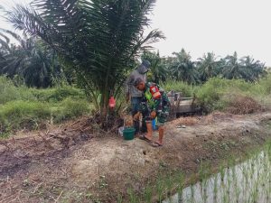 “Penyemprotan ini guna mengantisipasi hama ulat maupun wereng. Selain itu juga untuk memberikan kesuburan terhadap batang padi serta menghilangkan rumput ilalang yang bakal tumbuh di sekitar tanaman padi,” ucap Babinsa.