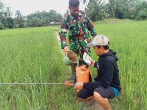 Seperti halnya yang dilaksanakan oleh Serma Zulkarnaini untuk mencegah hama sedini mungkin yaitu membantu penyemprotan tanaman padi warga desa binaan.