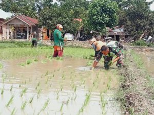 Dengan penuh semangat dan kebersamaan, Babinsa Sertu Iskandar menanam padi di sawah, menyatu dengan aktivitas petani.