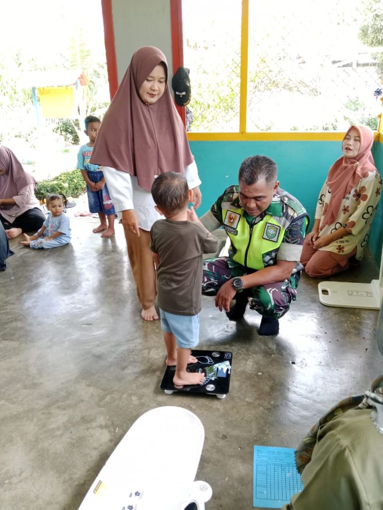 Aceh Tamiang – Dalam upaya mendukung program Balita Sehat, Keluarga Berencana (KB), dan pencegahan stunting, Babinsa Koramil 02/Karang Baru Serda Anton Sujarwo, mendampingi pelaksanaan pelayanan kesehatan ibu dan balita yang berlangsung di Desa Kebun Afdeling Seleleh, Kecamatan Karang Baru, Kabupaten Aceh Tamiang. Rabu (04/06/2025)
