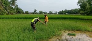 Aceh Tamiang – Dalam rangka mendukung program ketahanan pangan, Bintara Pembina Desa (Babinsa) Desa Telaga Meuku Dua Koramil 09/Banda Mulia, Kodim 0117/Aceh Tamiang Koptu Fauzi bersama Ibu Rodiah melaksanakan kegiatan pemeliharaan tanaman padi dengan membersihkan gulma dan rumput.