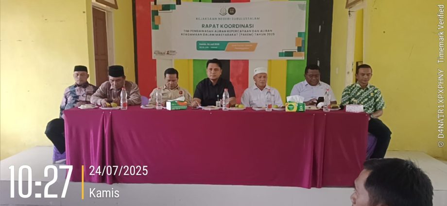 Subulussalam,Globaldetik.com  Di tengah arus deras informasi digital dan berkembangnya paham-paham menyimpang yang dapat merongrong persatuan bangsa, Kota Subulussalam menunjukkan langkah konkret. Kamis, 24 Juli 2025, Kejaksaan Negeri Subulussalam bersama lintas instansi menggelar Rapat Koordinasi Tim Pengawasan Aliran Kepercayaan dan Aliran Keagamaan dalam Masyarakat (Pakem) di Aula Kantor Camat Penanggalan.