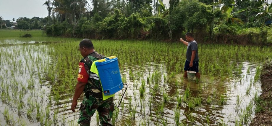 Aceh  Tamiang — Pelda Natra Wiriawan Babinsa Koramil 06/Manyak Payed, Kodim 0117/Aceh Tamiang membantu petani menyemprot hama keong mas dilahan sawah milik Bapak Sugino Pok Tan Lestari di Desa Bukit Paya, Kecamatan Mayak payed, Kabupaten Aceh Tamiang. Jumat (12/09/2025)