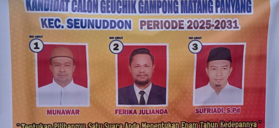 Pilciksung kali ini menghadirkan persaingan sengit di antara “tiga (3) kandidat yang bertarung” memperebutkan kursi kepemimpinan tertinggi di Gampong Matang Panyang. Ketiga kandidat yang dimaksud, berdasarkan amatan langsung dari awak media Globaldetik.Com, adalah Munawar (nomor urut 1), Ferika Julianda (nomor urut 2), dan Sufriadi, S.Pd (nomor urut 3).
