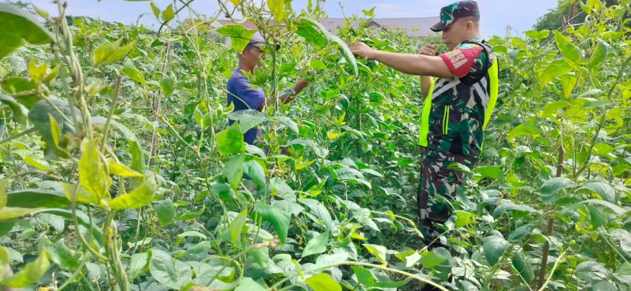 Aceh Tamiang – Babinsa Koramil 06/Manyak Payed Sertu Riki Fernandes melaksanakan kegiatan membantu petani merawat tanaman kacang panjang, di Desa Beteng Anyar, Kecamatan Manyak Payed. Selasa (07/10/2025)