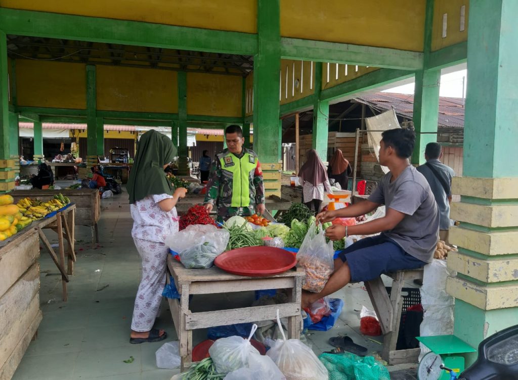 Aceh Tamiang – Babinsa Koramil 08/Rantau Serka Purnama Ginting turun ke warung – warung Untuk melaksanakan komsos sekaligus mengecek harga bahan pokok di Pajak Pagi, Desa Rantau Pauh, Kecamatan Rantau, Kabupaten Aceh Tamiang. Rabu (14/10/2025).