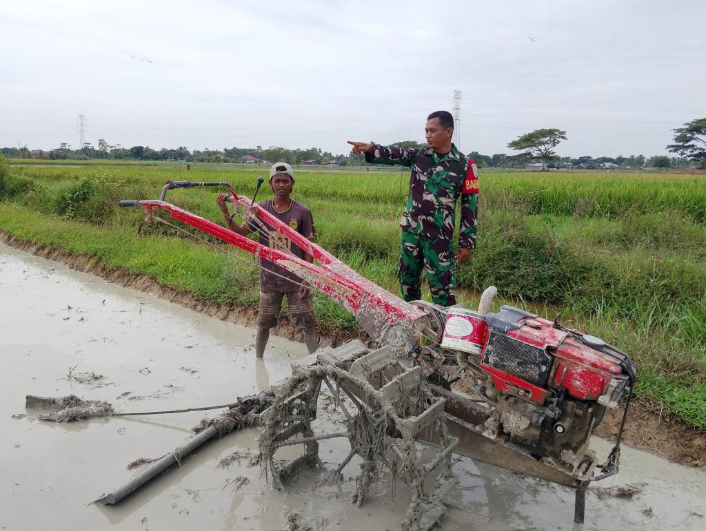 Aceh Tamiang – Babinsa Koramil 06/Manyak Payed Serka Budi melaksanakan pendampingan Pok Tani Tunas Muda memantau dan memberi semangat kepada petani Padi yg sedang membajak sawah di Desa Sampaimah, Kecamatan Manyak Payed, Kabupaten Aceh Tamiang. Senin (20/10/2025).