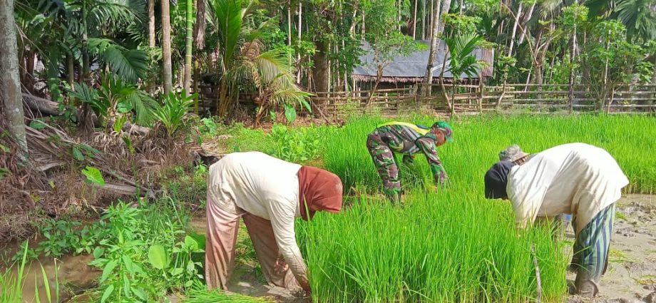 Aceh Tamiang – Babinsa Koramil 03/Seruway Serda Budi membantu mencabut benih padi yang sudah siap tanam milik warga di Desa Sidodadi, Kecamatan Seruway, Kabupaten Aceh Tamiang. Minggu (23/11/2025).
